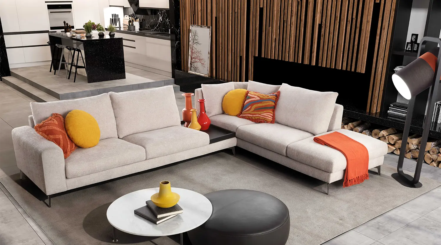 Soft cushions alternate with practical wenge tops that create an original play on shapes and lines.