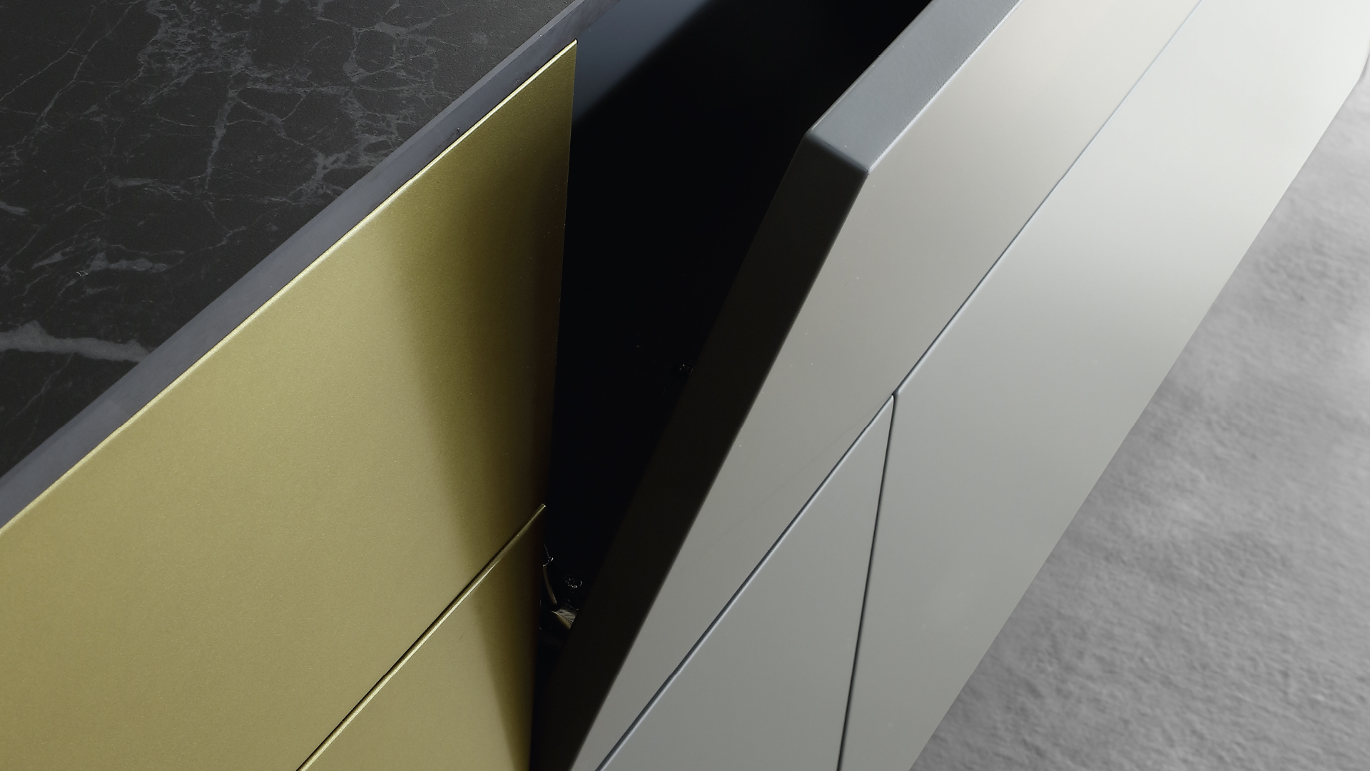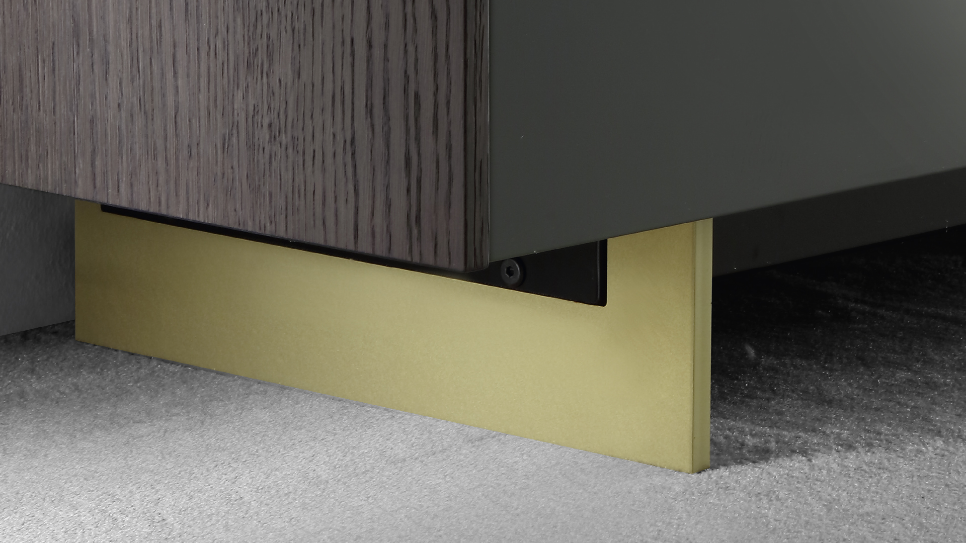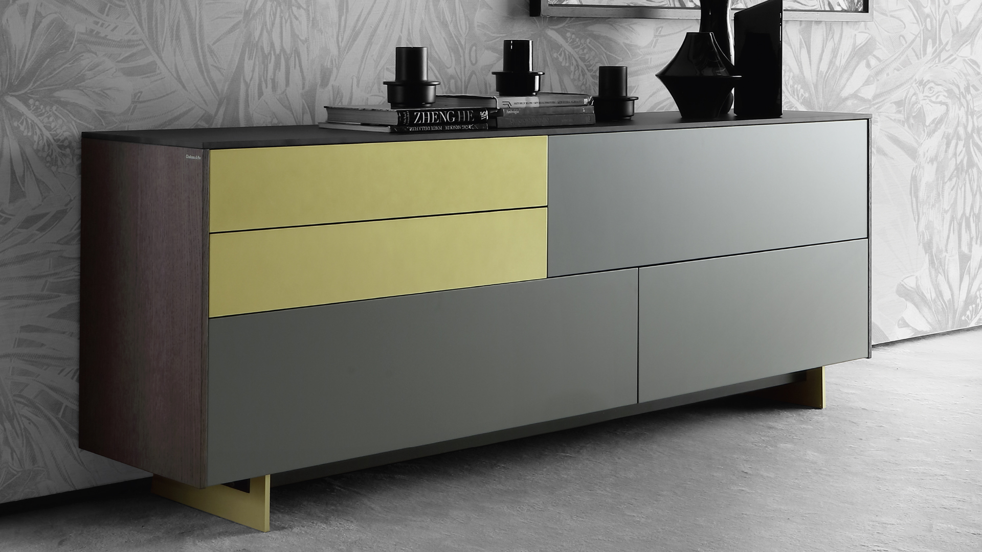 Oro(意大利语中的黄金)让我们想到珍贵、闪亮、永恒的东西。这些主题词使“Oro capsule”餐边柜脱颖而出的。在任何生活中,任何沙发,无论你的别墅风格如何,Oro边柜都会给人一种尊贵的感觉。片状式的金属脚巧妙地将柜体连接也突显了这个产品的精确性,且金属脚与抽屉和壁龛的颜色也保持一致。框架为灰橡木色,柜门以铁灰色烤漆为主, 抽屉面板为金色烤漆,边柜柜面为laminam陶瓷面板(nero greco)并搭配金色脚。 尺寸参考:2130×77,5×460 SIDEBOARD ORO 框架为灰橡木色,柜门为铁灰色烤漆为主, 抽屉面板为金色烤漆,边柜柜面为laminam陶瓷面板(nero greco),搭配金色脚。 尺寸参考:1230×141,5×460